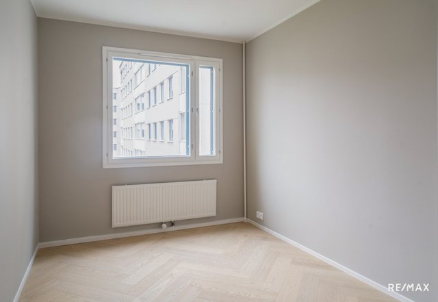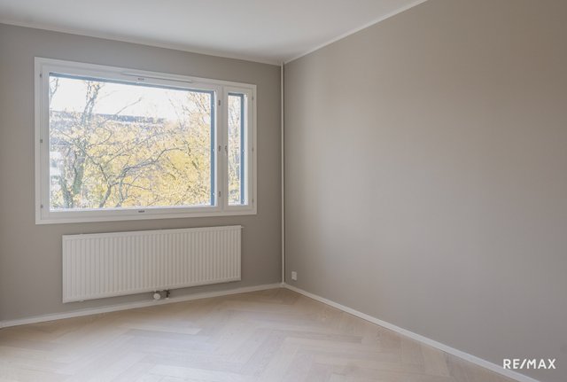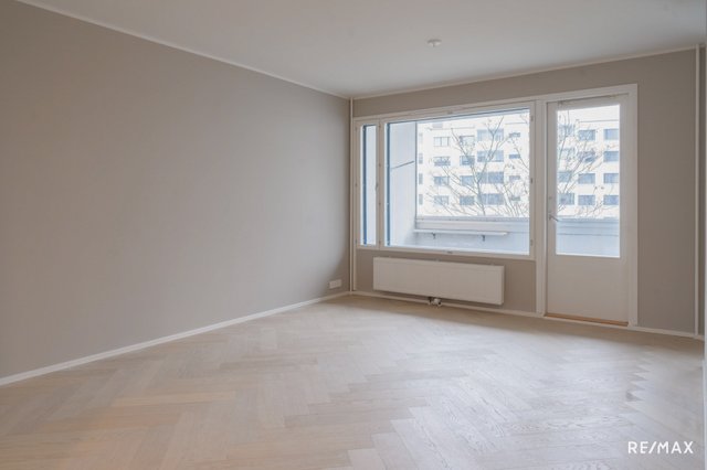 Huoneiston lattiat ovat tyylikästä kalanruotoparkettia ja eteisen lattia käytännöllistä suurkivilaattaa. Keittiössä on hyvät kodinkoneet, pähkinän sävyiset kaapistot ja kauniit vaaleat kivitasot – kokkaajan unelma. Keittiöön mahtuu pieni ruokapöytä.