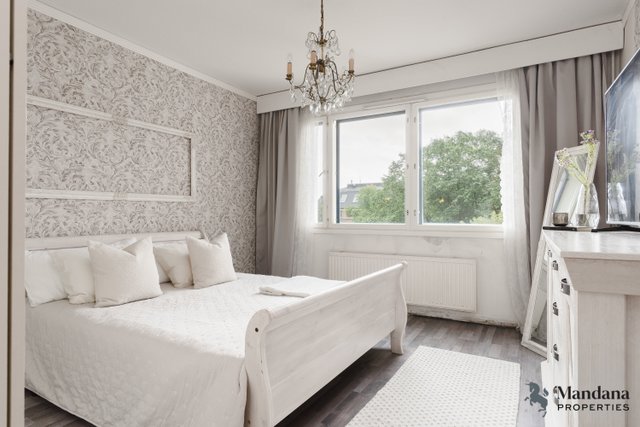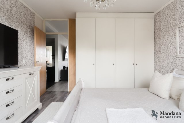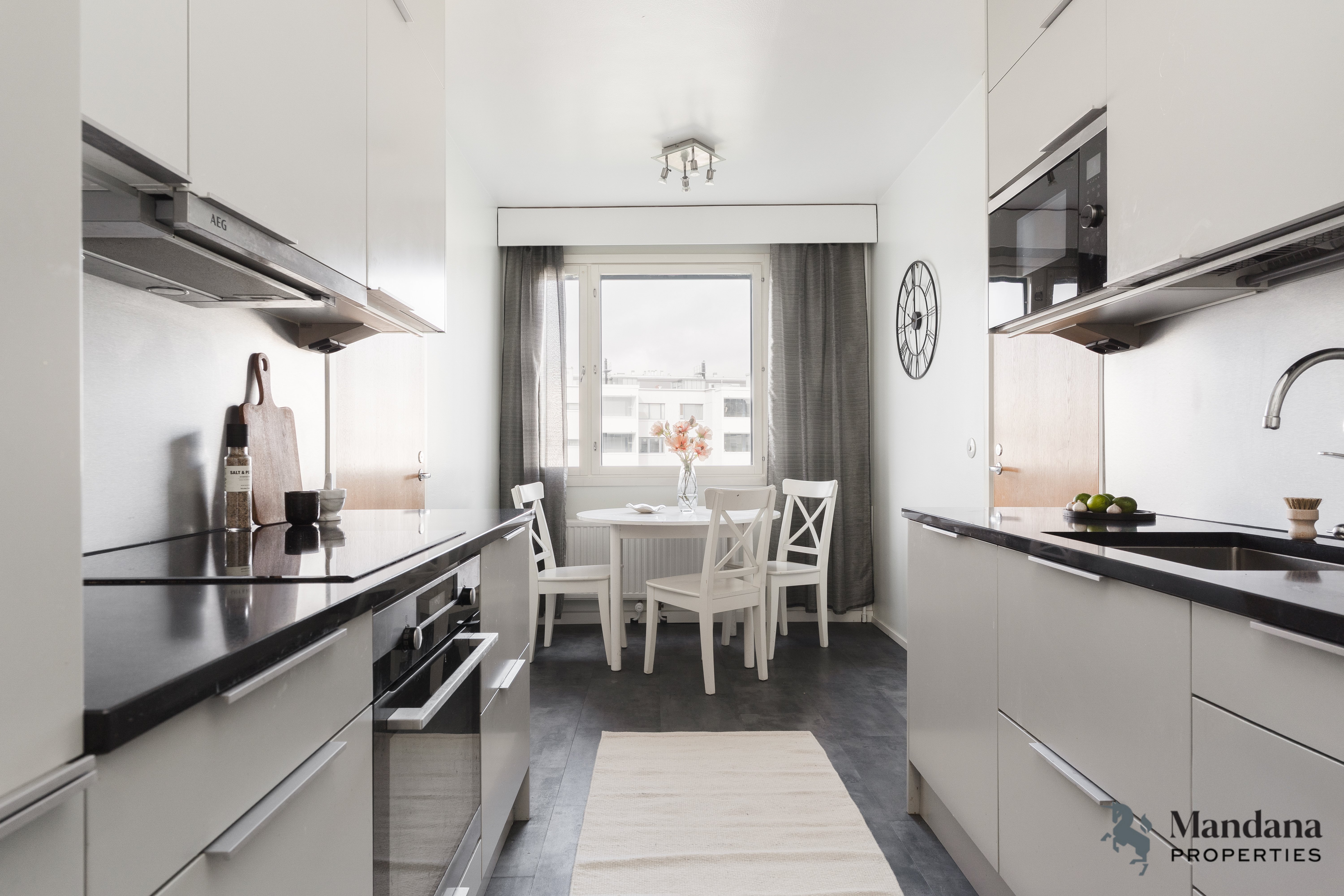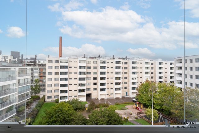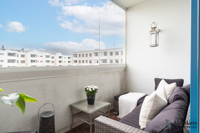 Länteen avautuva lasitettu parveke tarjoaa näkymän rauhalliselle sisäpihalle. Kaksi makuuhuonetta soveltuvat mainiosti perheelle, työtilaksi tai vierashuoneeksi, ja vaatehuone tuo runsaasti säilytystilaa arjen tarpeisiin.