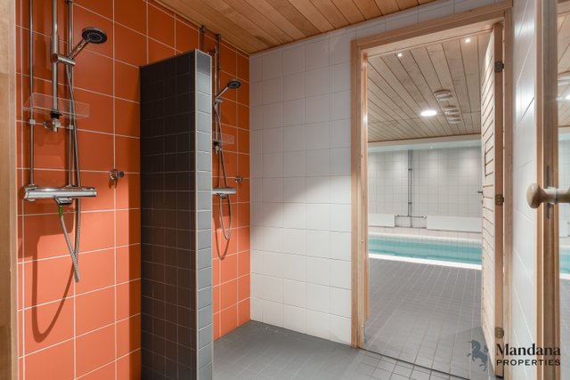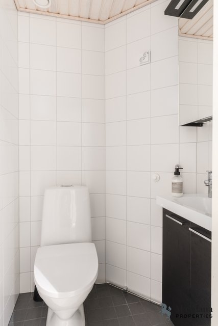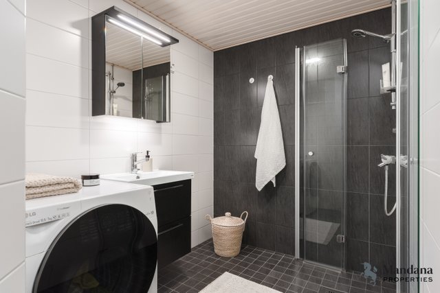 - Suihku, suihkuseinä, pesukoneliitäntä, lattialämmitys (Mukavuuslattialämmitys), peilikaappi, pesuallas, ja allaskaappi