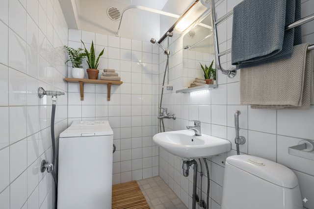 - WC-istuin, suihku, pesukoneliitäntä, peili, pesuallas, ja bidee-suihku