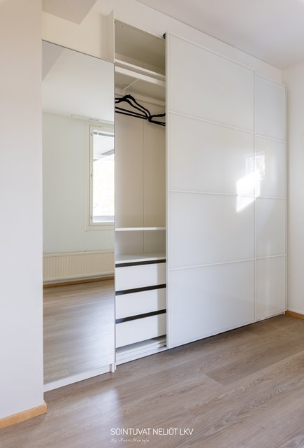- Jääkaappi, astianpesukone, erillisuuni (uuni/mikroaaltouuni-yhdistelmälaite), liesituuletin (aktiivihiilisuodattimella ja led-valolla), led-valaisinlista, ja erillinen pakastin (sijoitettu eteisen liukuovikaapistoon)