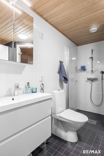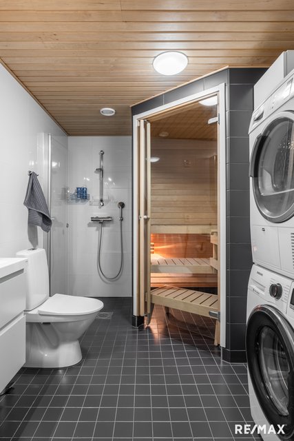 - Tässä tilavassa kylpyhuoneessa on tilaa myös pyykinhuollolle (paikka pesutornille). Suihku on sijoitettu kätevästi nurkkaan ja suihkuseinä estää kylpyhuoneen kastumisen suihkun aikana. Varustus: Suihku, suihkuseinä, peilikaappi, allaskaappi, wc-istuin, bideesuihku, pesukoneliitäntä. Lattia tummanharmaata laattaa, seinät suurta valkoista laattaa. Lattialämmitys.