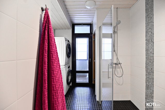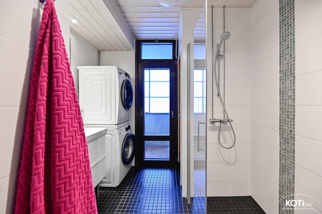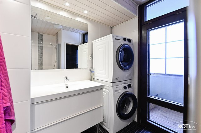 - Suihkuseinä, pesukoneliitäntä, lattialämmitys, suihku, peili, ja pesuallas