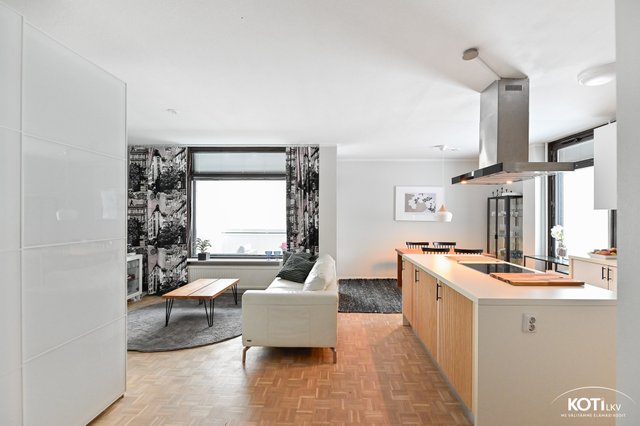 Tässä toimivapohjaisessa asunnossa on kaksi tilavaa makuuhuonetta, vaatehuone, erillinen wc sekä saunallinen kylpyhuone, josta käynti lasitetulle parvekkeelle. Keittiö olohuone ja ruokailutila muodostavat erittäin avaran ja valoisan kokonaisuuden. Lisäksi olohuoneesta on käynti toiselle lasitetulle parvekkeelle.