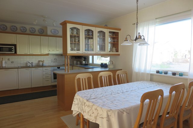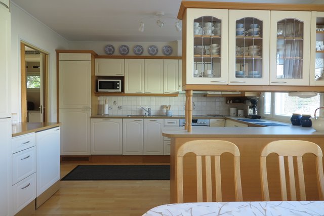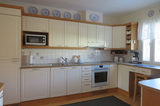- Jääkaappipakastin, mikroaaltouuni, astianpesukone, liesi, keittiösaareke, liesituuletin, jääkaappi, ja erillinen pakastin