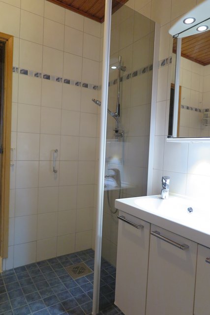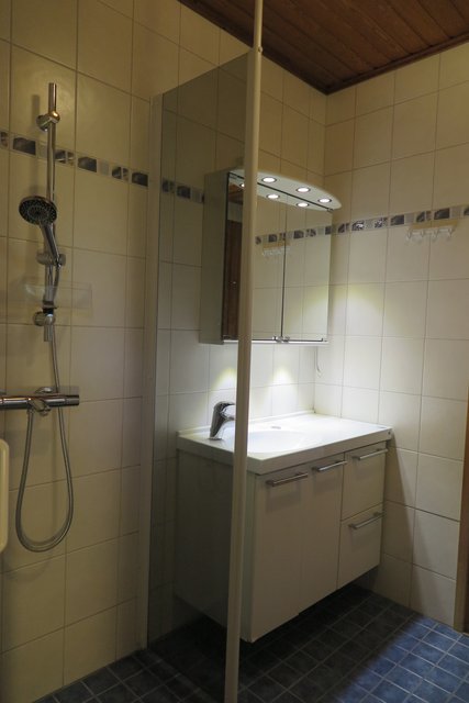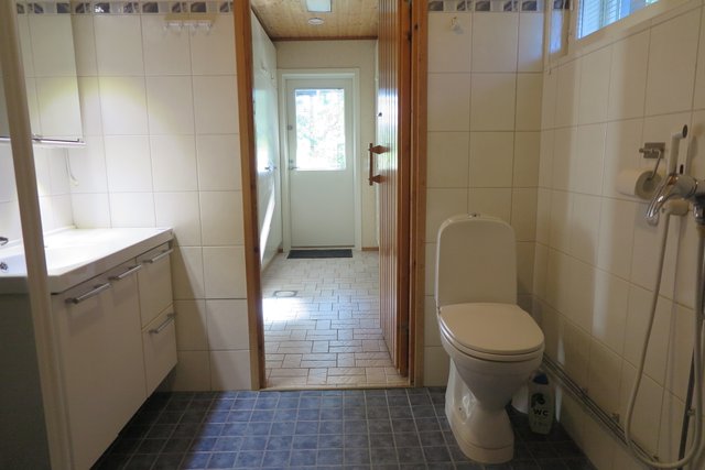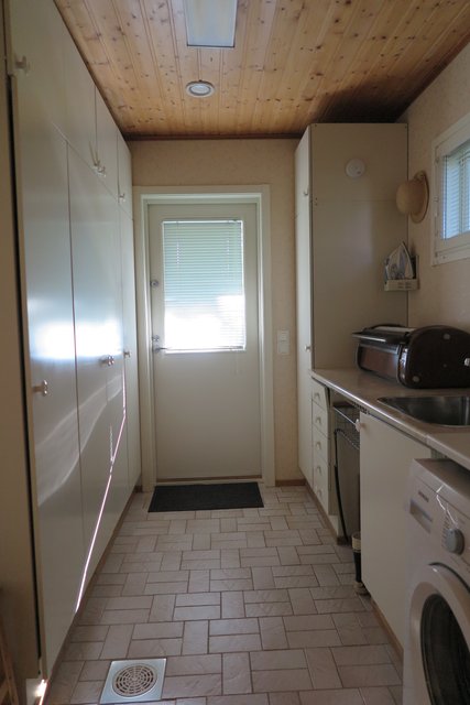 - Pesukone, pesukoneliitäntä, lattialämmitys, pesuallas, lattiakaivo, pyykkikaapit, pöytätaso, ja tila pesutornille