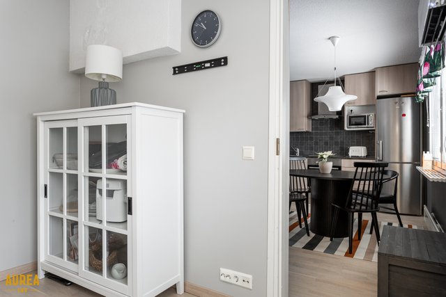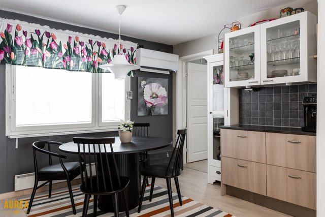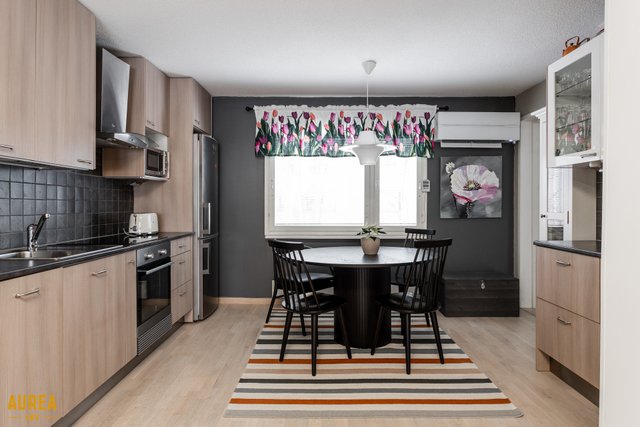 - Vaaleat kaapistot, laminaattitasot. Varusteet: astianpesukone, induktioliesi, liesituuletin, jääkaappi-pakastin. Keittiö yhteydessä olohuoneeseen. Keittiössä myös ilmalämpöpumppu.
