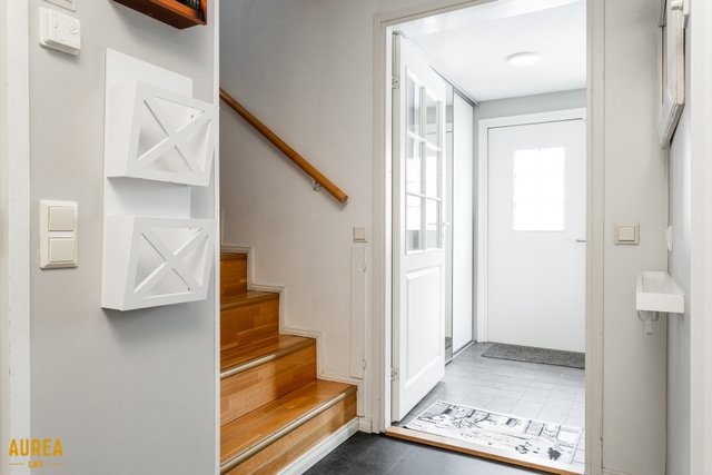 - Kodinhoitotila rakennettu eteisen tilojen yhteydessä. Pesukoneliitintä, vesipiste ja lattiakaivo.