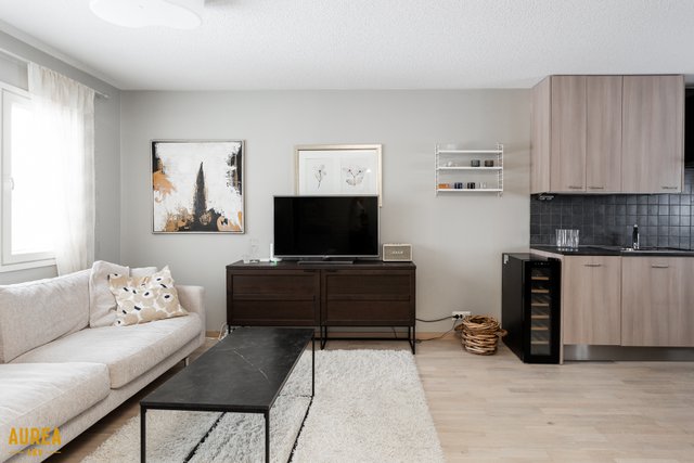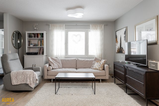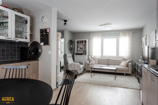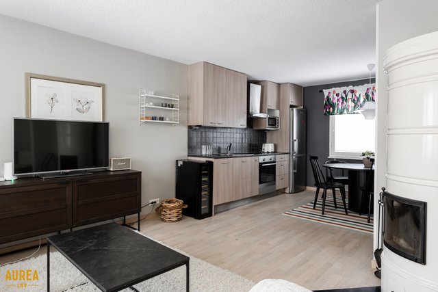 - Hyvänkokoinen, valoisa olohuone joka yhdistyy keittiön kanssa. Olohuoneessa pönttöuuni.