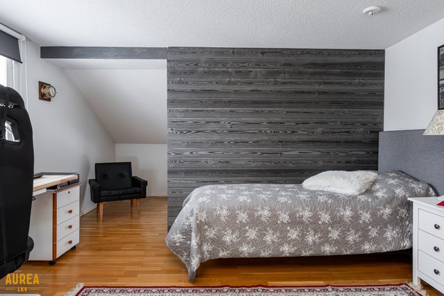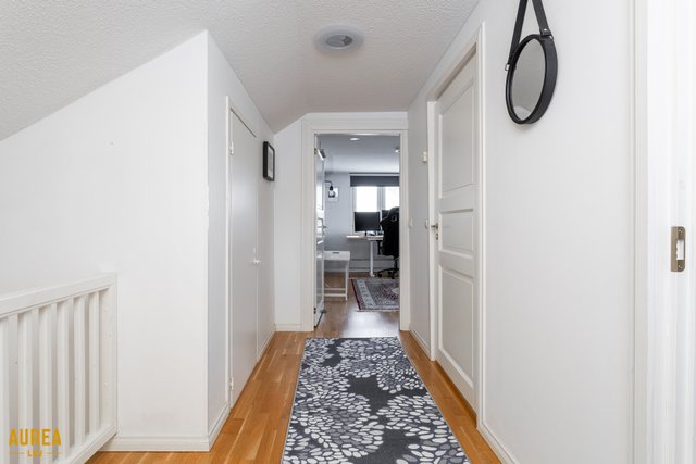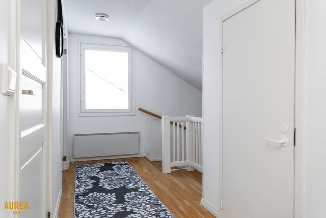Yläkerrasta löytyvät kaksi makuuhuonetta, kylpyhuone suihkulla ja wc sekä runsaasti säilytystilaa. Iso makuuhuoneen viisteet on avattu, joten tilaa voi käyttää esimerkiksi lasten makuuhuoneina tai säilytystiloina, tarpeen mukaan. Aulassa on lisäksi vaatehuone.
