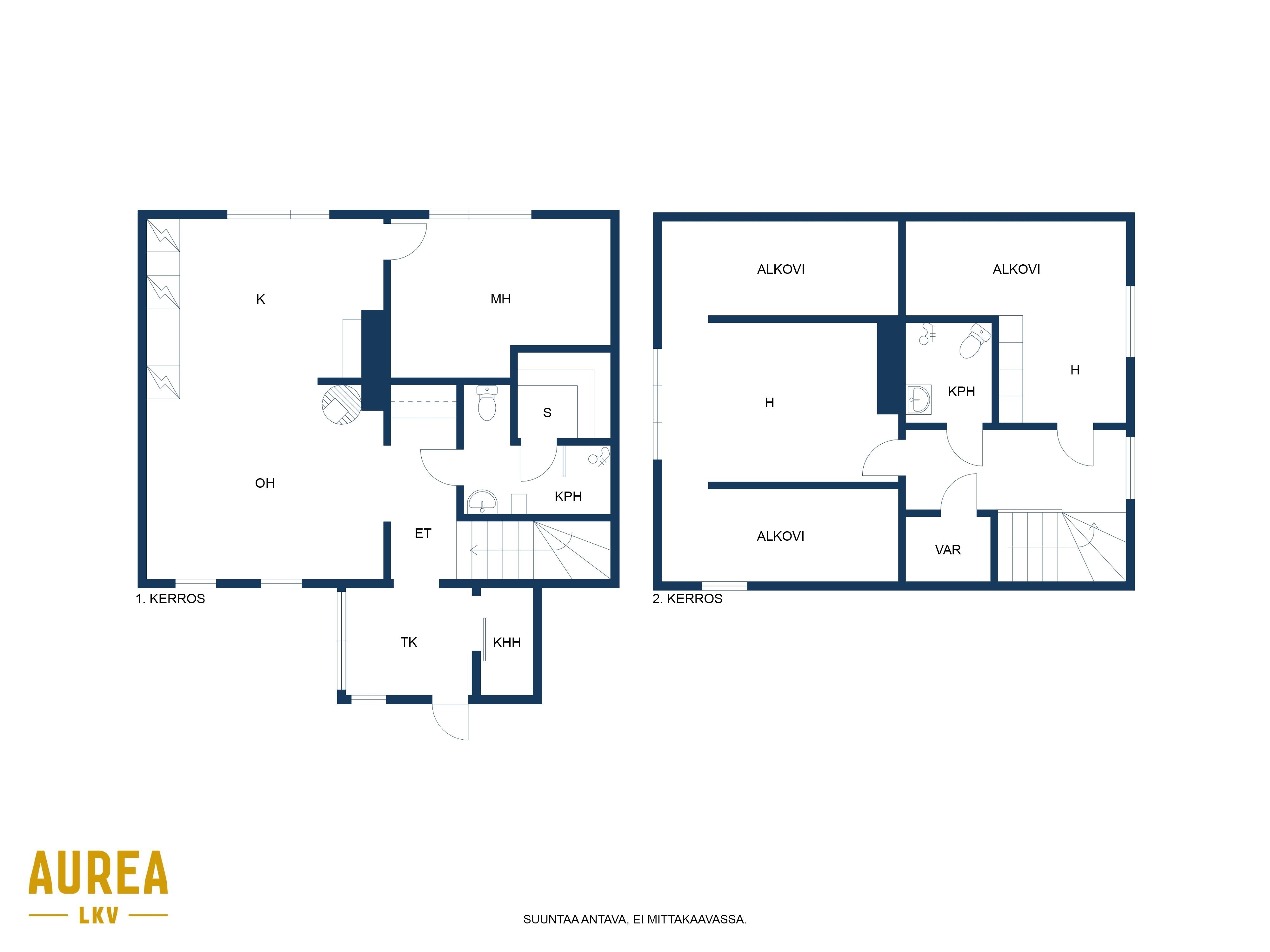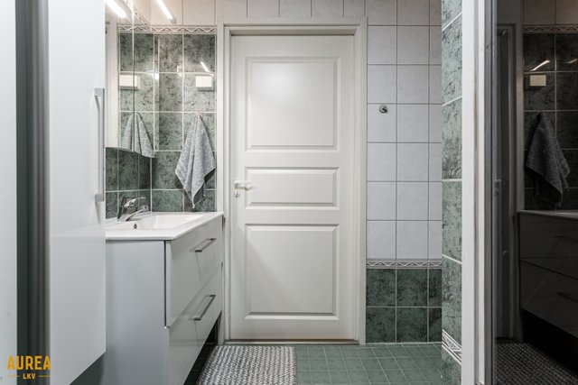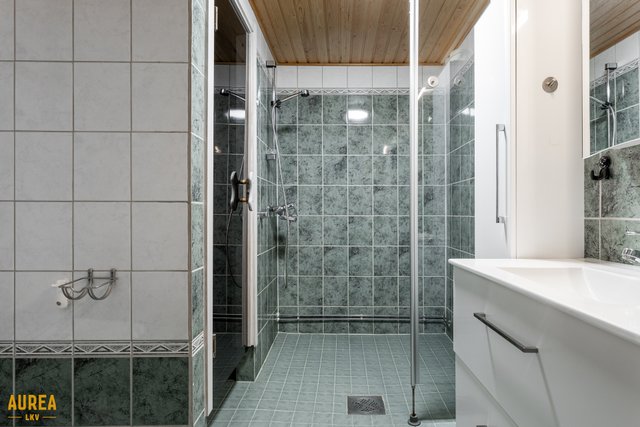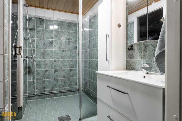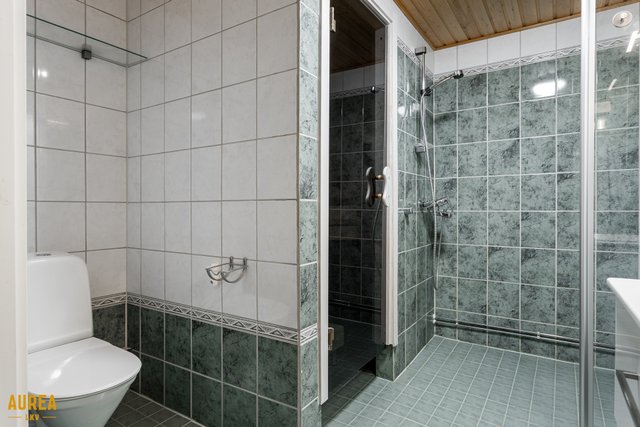 - Alakerrassa kylpyhuone, jossa wc ja suihku sekä sauna. Yläkerrassa erillinen wc/kph. Alakerrassa erillinen kodinhoitohuone.