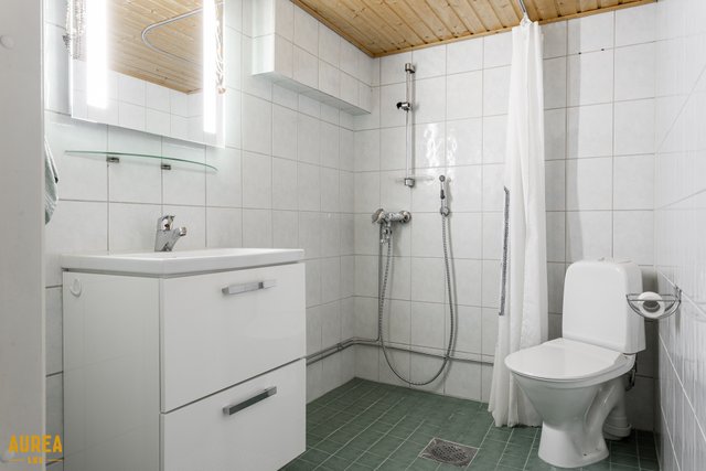 - WC-istuin, suihku, suihkuseinä, lattialämmitys, peili, pesuallas, allaskaappi, ja seinäkaappi