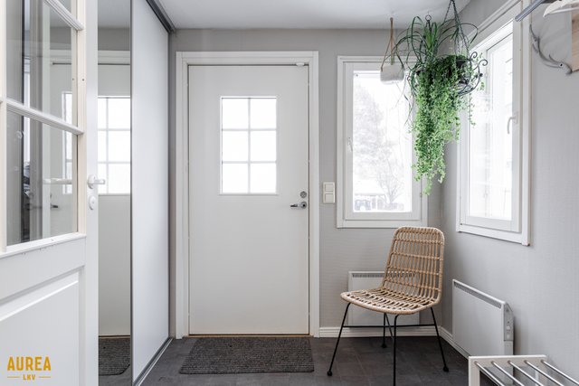 Sisääntulokuistista pääsee kätevästi kodinhoitohuoneeseen, jossa on tilaa pyykkihuollolle.