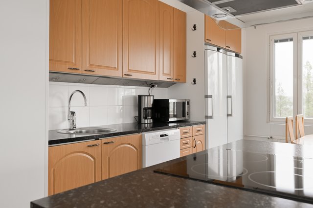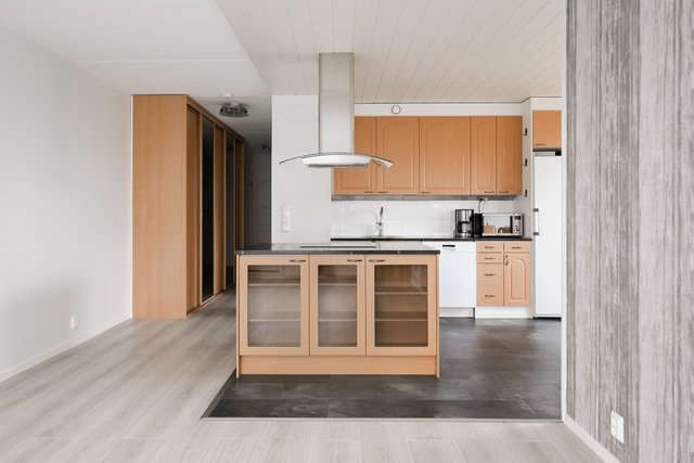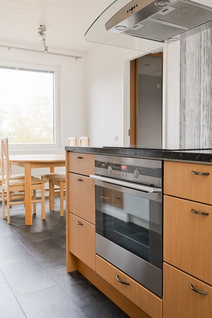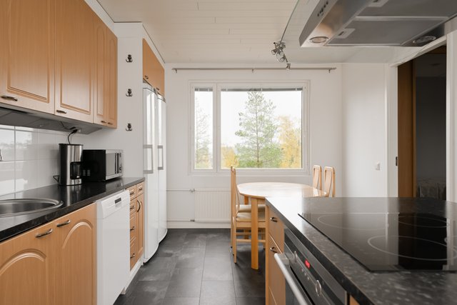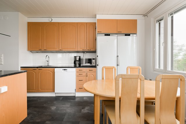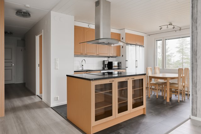 - Jääkaappipakastin, astianpesukone, keittiösaareke, liesi, ja liesituuletin