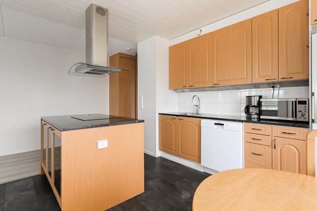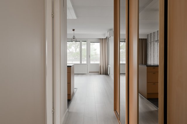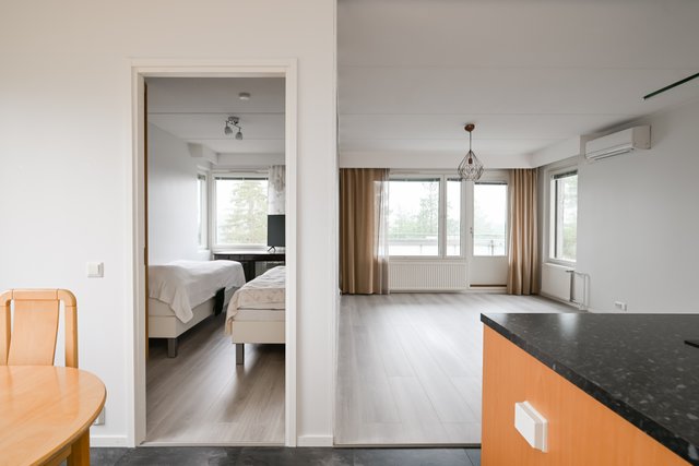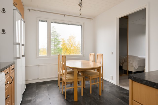 Keittiö on varusteltu nykyaikaisesti, ja sieltä löytyy muun muassa astianpesukone ja saareke, joka tarjoaa runsaasti työskentelytilaa. Olohuoneesta on käynti lasitetulle parvekkeelle, jonne aurinko paistaa mukavasti. Parveke on täydellinen paikka nauttia aamukahvista tai rentoutua iltaisin.