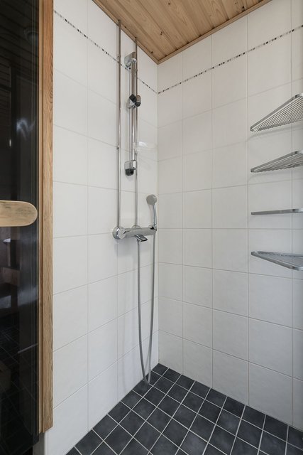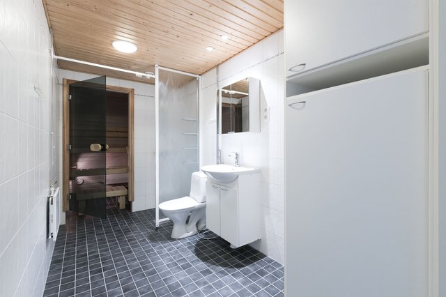 - WC-istuin, suihku, suihkuseinä, pesukoneliitäntä, peilikaappi, pesuallas, allaskaappi, bidee-suihku, ja pyykkikaapit