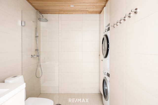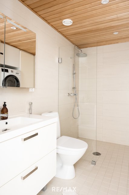 - WC-istuin, suihkuseinä, pesukoneliitäntä, peilikaappi, pesuallas, allaskaappi, ja bidee-suihku