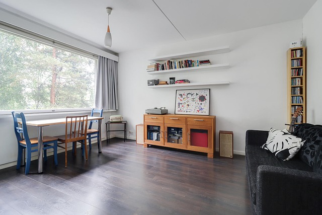 - Vinyylilaminaattilattia, seinällä kolme hyllyä,