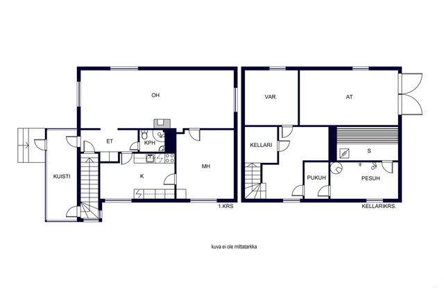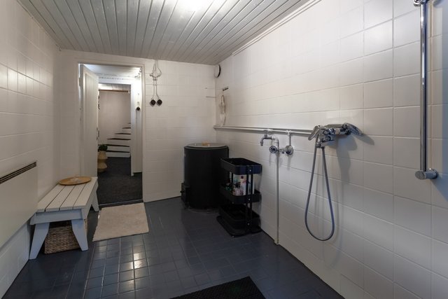 - 1960 vahvistetun pääpiirustuksen mukaan rakennuksen huoneistoala on 72,4 m², tähän päälle on laskettu kellaritilasta pesuhuone ja sauna yhteensä noin 13 m², yhteensä 86 m². Rakennustiedot dokumentin mukaan asuintilojen pinta-ala on 73 m² ja kerrosala 97 m². Muihin tiloihin on laskettu kylmä eteinen noin 10 m², sekä kellarikerroksesta pukuhuone noin 1 m², aulatila noin 7 m², pieni varasto noin 4 m², iso varasto 9 m² ja autotalli noin 17 m². Kohteen hinta ei ole pinta-alaperusteinen (rakennus tai tila) vaan perustuu kokonaisuuteen. Mikäli pinta-aloista halutaan varmistua suositellaan pinta-alojen tarkistusmittausta.