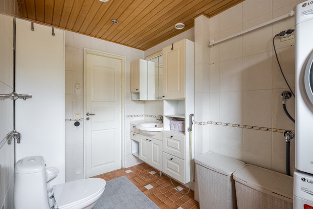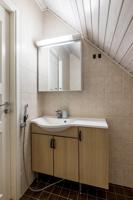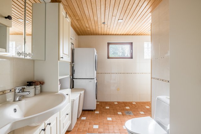 - WC-istuin, pesukoneliitäntä, suihku, lattialämmitys, peilikaappi, allaskaappi, bidee-suihku, pesuallas, peili, ja kiinteät valaisimet