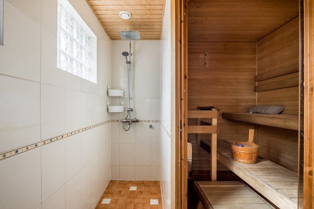 Alakerrasta löytyy myös kaksi makuuhuonetta sekä takkahuone. Saunan jälkeen voit rentoutua idyllisen avotakan äärellä. Alakerran kaikissa huoneissa on talon tyyliin sopivat laminaattilattiat. Olohuoneesta ja keittiöstä löytyy himmennettävät, tunnelmaa lisäävät, kiinteät kattovalaisimet.