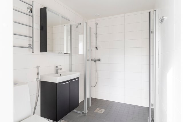 - Suihku, suihkuseinä, lattialämmitys, peilikaappi, allaskaappi, pesuallas, bidee-suihku, pyyhepatteri, ja wc-istuin