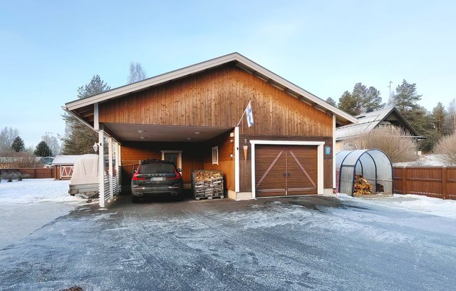 Upea lasitettu terassi talon edustalla kutsuu nauttimaan kesäpäivistä. Autokatoksessa on myös sähköauton latauspistoke, mikä tuo lisämukavuutta nykypäivän tarpeisiin.
