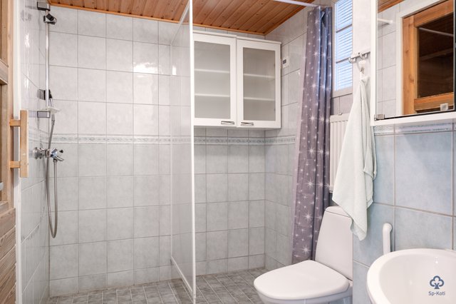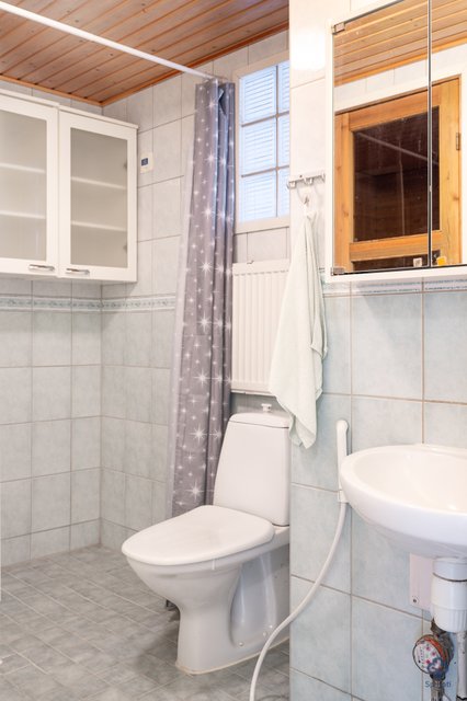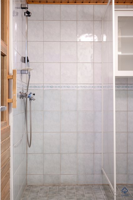 - WC-istuin, suihku, suihkuseinä, pesukoneliitäntä, peilikaappi, pesuallas, ja bidee-suihku