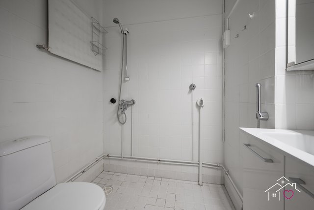 - Kylpyhuone on laatoitettu. Kylpyhuoneessa on suihku, suihkuverhotanko, wc-istuin, allas, allaskaappi, peilikaappi ylävalolla, bidesuihku ja pesukoneliitäntä.