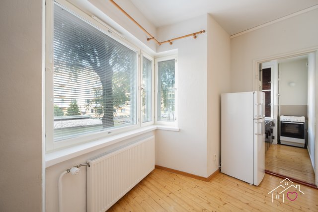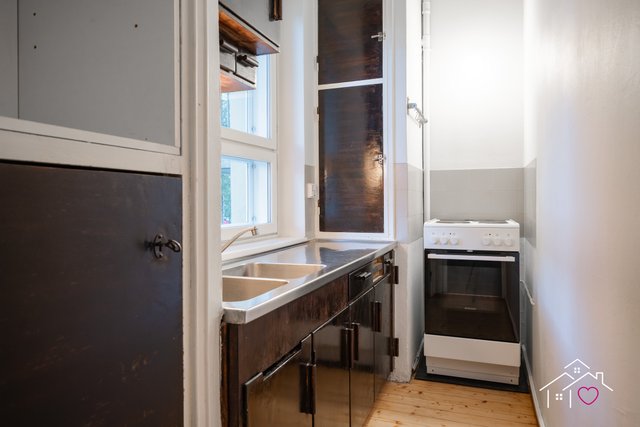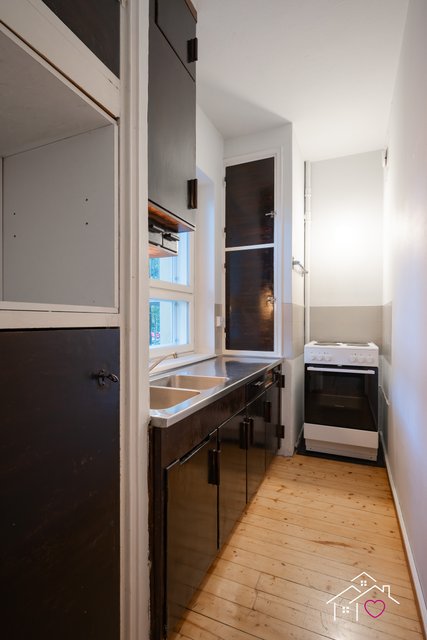 - Ikkunallisessa keittokomerossa on alkuperäiset kaapistot, valaisin, Rosenlewin sähköliesi, 2 allasta ja hana. Välitila on laatoitettu ja seinät on maalattu. Lattia on puuta.