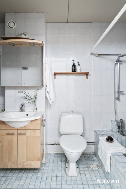 - WC-istuin, kylpyamme, suihku, peilikaappi, ja allaskaappi