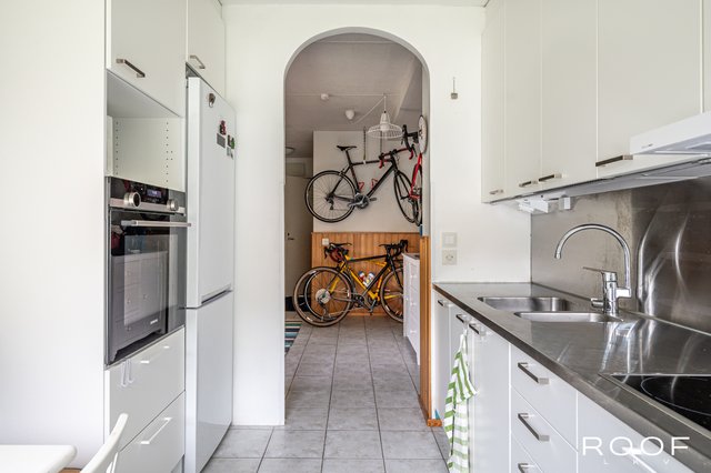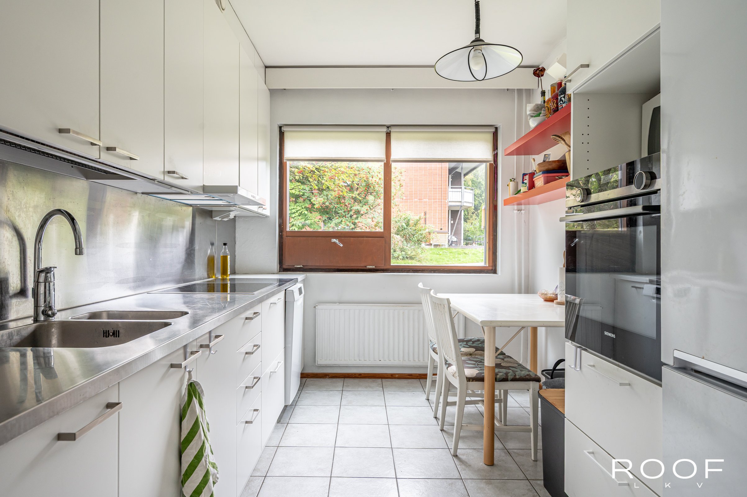 - Vaaleasävyinen keittiö uusittu koneineen vuonna 2020. Käytännöllinen metallinen keittiötaso, jonka reunaosa laminaattia. Laatoitettu lattia, maalatut seinät.