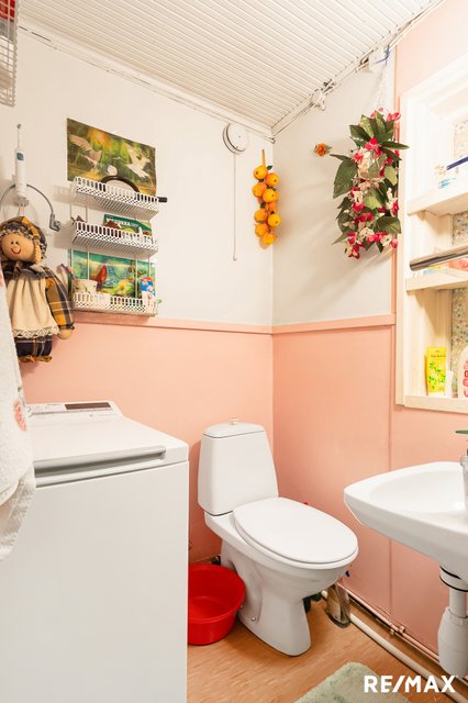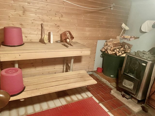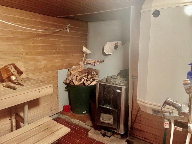 - Huonekorkeudeltaan matalat pesutilat suihkuineen sijaitsevat kellarissa sijaitsevassa vanhan ajan saunassa, jonne on käynti ulkokautta. Saunassa sijaitsee myös lämminvesivaraaja.