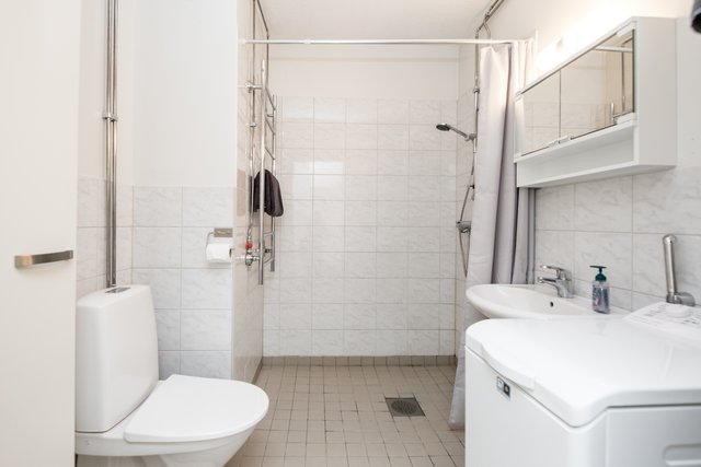- WC-istuin, suihku, pesukoneliitäntä, ja peilikaappi