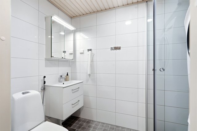 - Suihku, wc-istuin, pesukoneliitäntä, suihkuseinä, lattialämmitys, peilikaappi, bidee-suihku, ja allaskaappi