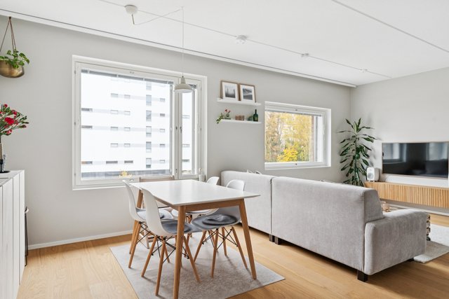 - Valoisa olohuone, jonka yhteydessä keittiö ja ruokailutila.
