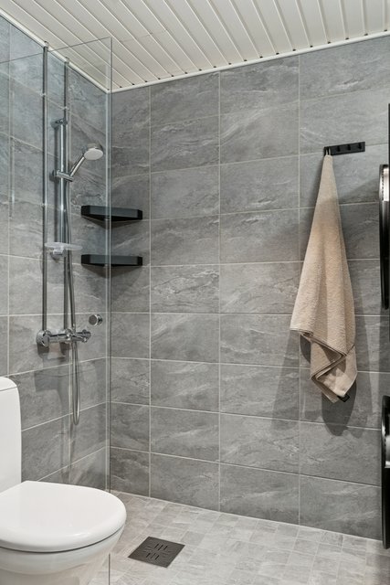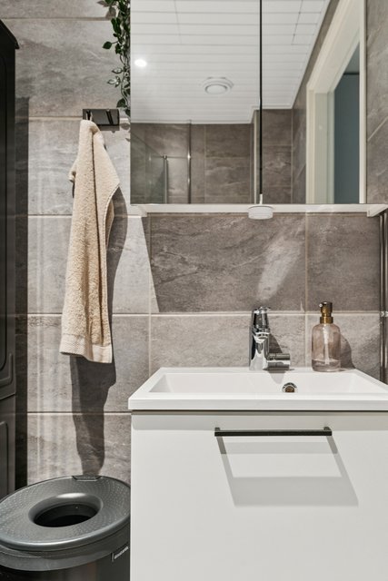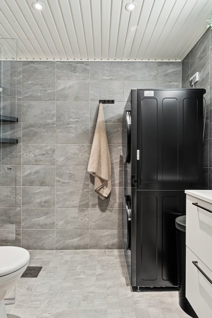 - WC-istuin, suihku, lattialämmitys, peilikaappi, pesuallas, allaskaappi, bidee-suihku, pesukoneliitäntä, ja suihkuseinä