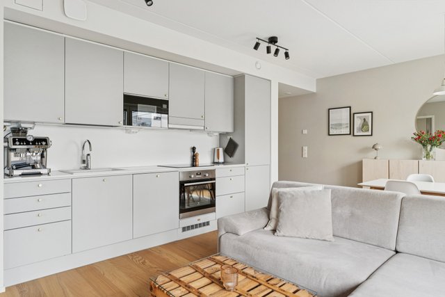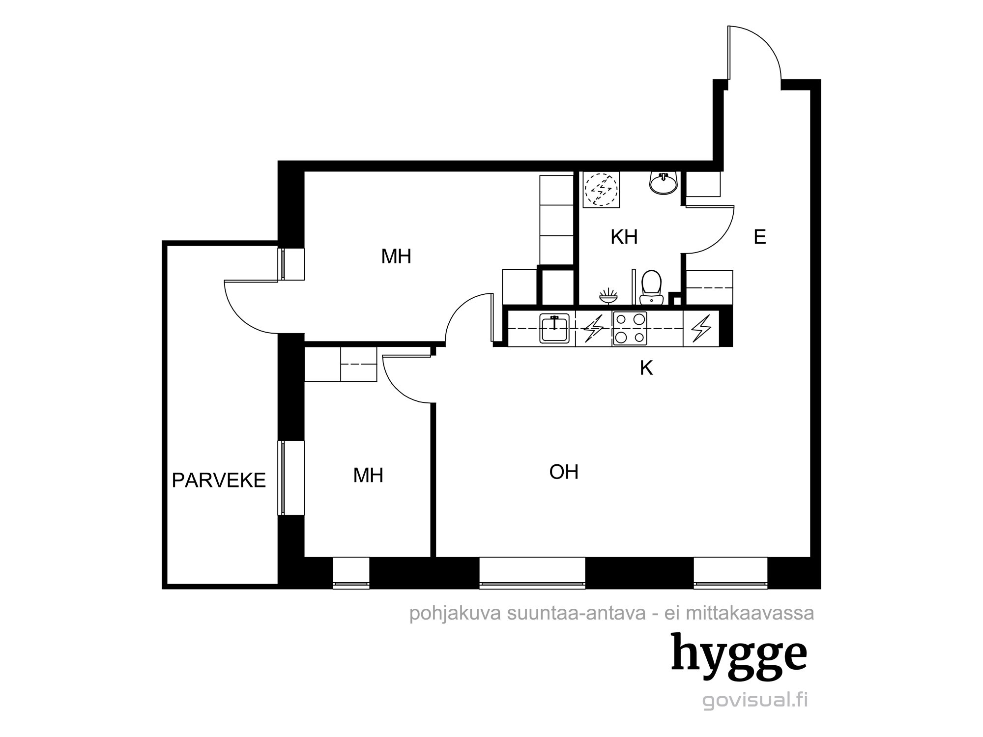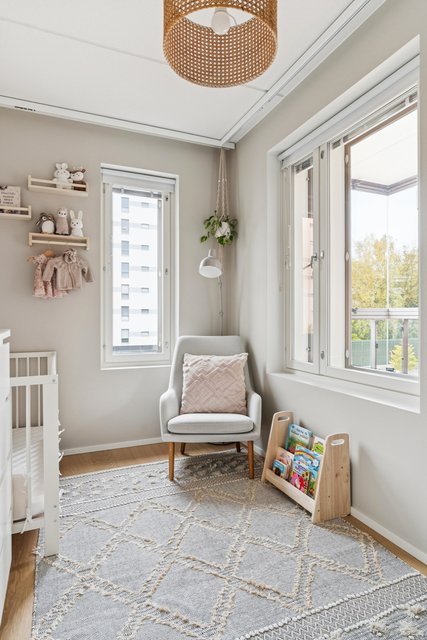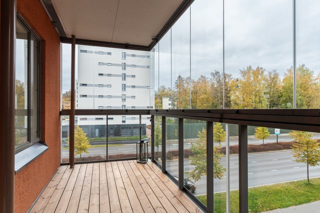Asunnon sydän on avara olohuone, joka yhdistyy saumattomasti keittiöön ja ruokailutilaan.  Kaksi makuuhuonetta tarjoavat mukavasti tilaa, ja suuremmasta makuuhuoneesta on käynti tilavalle lasitetulle parvekkeelle, jossa voi nauttia rauhallisista hetkistä. Asunnossa on kauttaaltaan kovapuulattia ja tyylikkäästi valitut materiaalit ja sävyt. Kylpyhuone on moderni ja hyvin varusteltu, lattialämmityksellä ja pesukoneliitännällä.