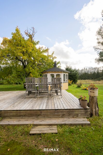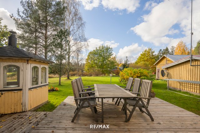 - Iso piha, joka tarjoaa mahdollisuuden monenlaisiin käyttötarkoituksiin. Talon yhteydessä terassi ja kahden auton autokatos.