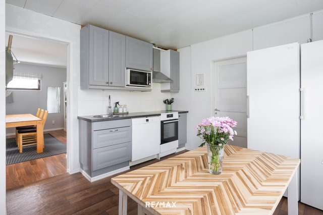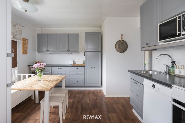 - Keittiö on remontoitu vuonna 2013, ja se tarjoaa runsaasti kaappitilaa sekä tilan pienelle ruokapöydälle. Pinnat ovat siistit ja hyvässä kunnossa. Lämminsävyinen ja kodikas kokonaisuus yhdistyy toimivaan pohjaratkaisuun sekä käytännöllisiin säilytysratkaisuihin, jotka tekevät keittiöstä viihtyisän ja arjessa helppo käyttöisen.