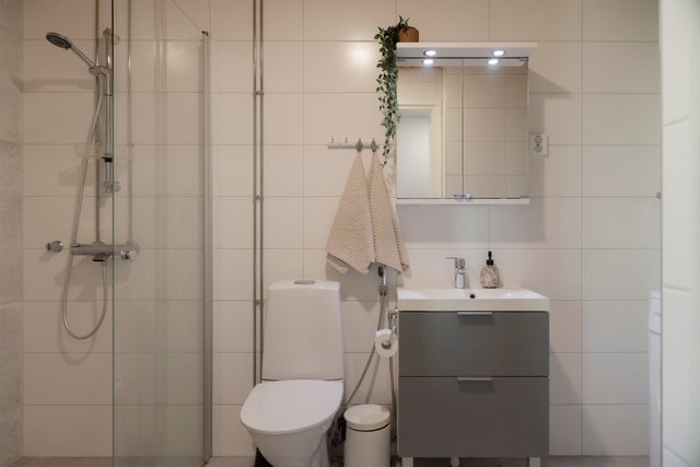 - WC-istuin, suihkuseinä, pesukoneliitäntä, peilikaappi, pesuallas, allaskaappi, bidee-suihku, lattialämmitys, ja suihku
