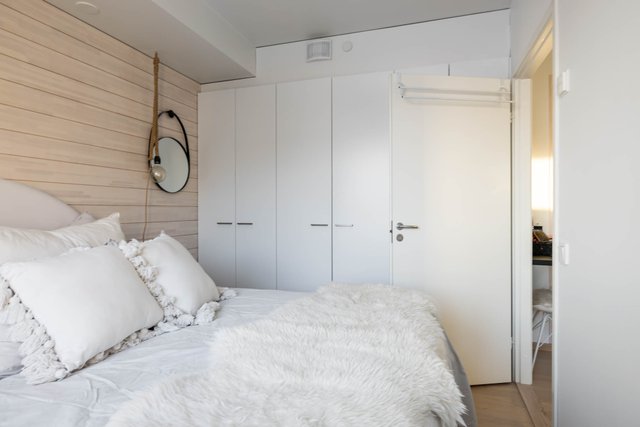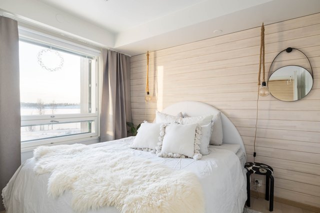 - Lattia parketti, seinät maalattu/ hirsipaneelitehosteseinä. Makuuhuoneestakin upea näkymä Näsijärvelle! Koko seinän levyinen kaapisto.