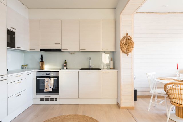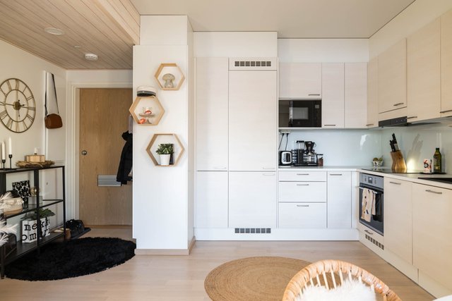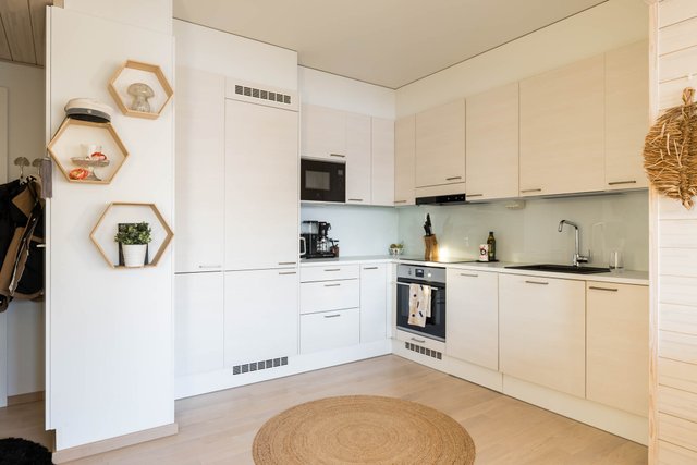 - Erillisuuni, induktiotaso, jääkkappi/pakastin, astianpesukone, mikroaaltouuni, liesituuletin. Kaikki kodinkoneet integroitu. Lattia parketti, seinät maalattu.