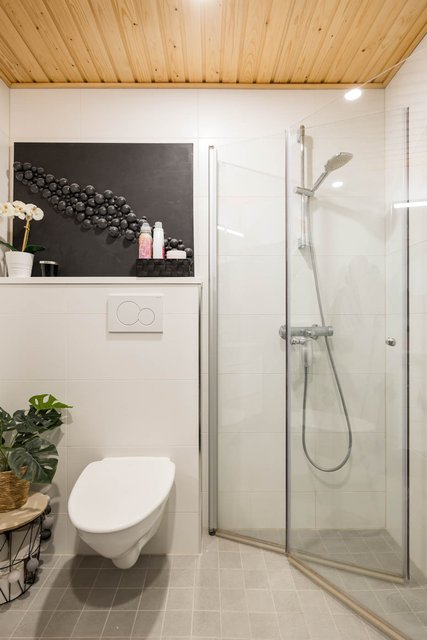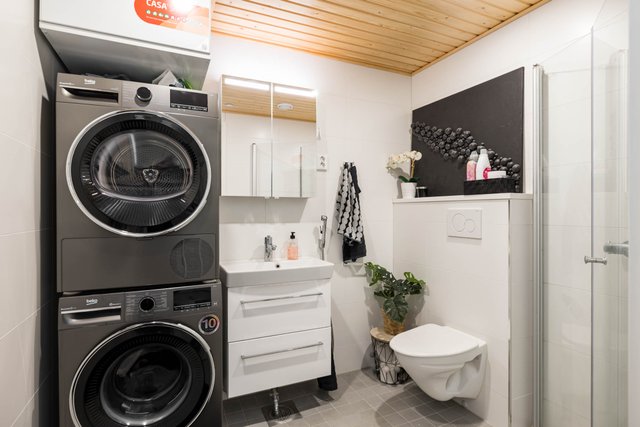- Tila pesutornille, seinäwc-istuin, bidé-suihku, peilikaappi, allas ja allaskaappi, suihku, suihkuseinä, lattialämmitys. Lattiat ja seinät laatta.