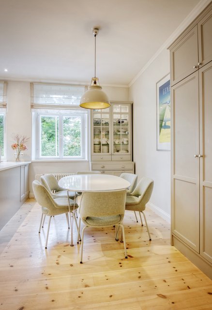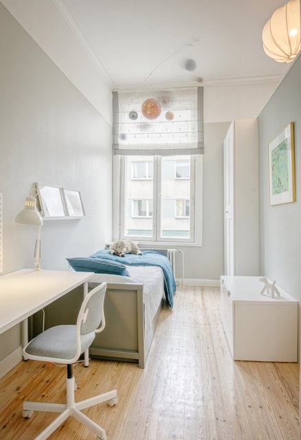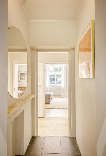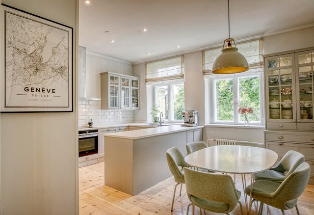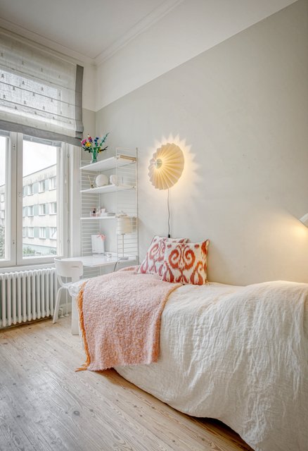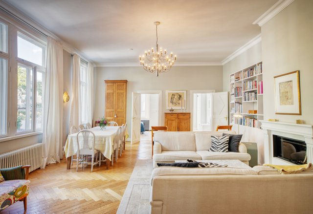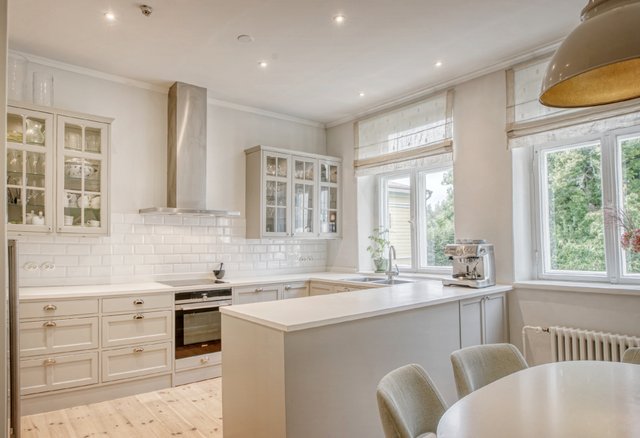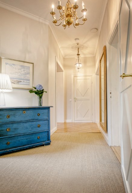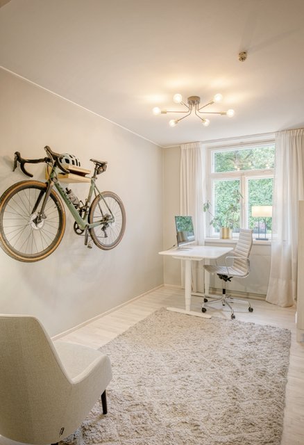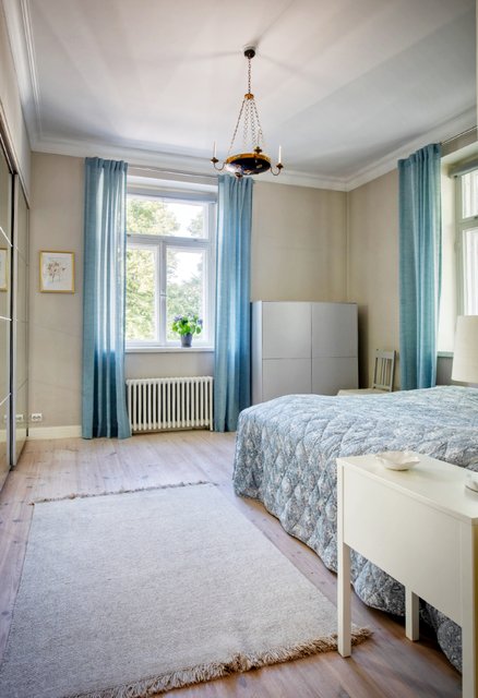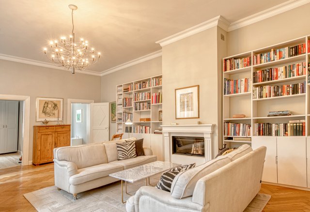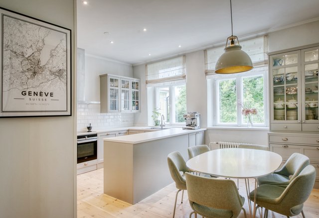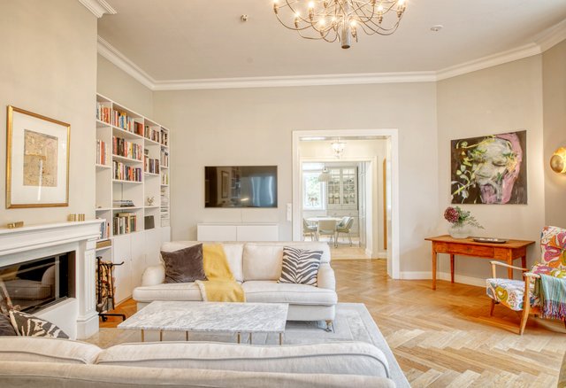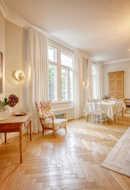 Asunnon korkeat huoneet ja isot ikkunat tuovat runsaasti luonnonvaloa, ja olohuoneen kaunis uusi kalaruotoparketti yhdessä uusitun tulisijan luo tilaan elegantin tunnelman. Moderni keittiö, jossa on runsaasti säilytystilaa ja nykyaikainen koneistus, tekee ruoanlaitosta nautinnon.