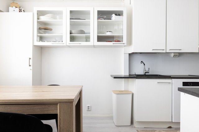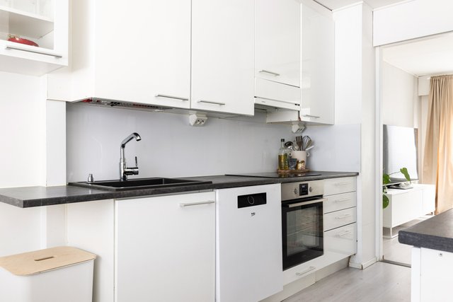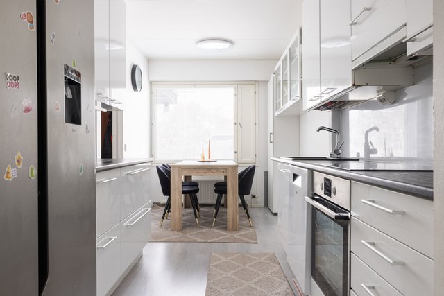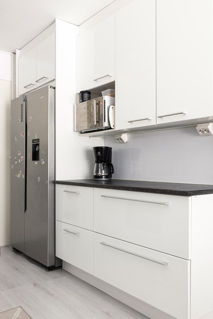 - Jääkaappipakastin Side by Side, astianpesukone, liesitaso, kiertoilmauuni, liesituuletin, upotettu iso allas. Mikrolle hylly. Ruokapöydän yläpuolella kauniille astioille yläkaappi lasiovilla. Lisäksi korkea kaappi. Hyvin pöytätilaa ruoanlaittoon. Tummanharmaa pöytätaso. Lattia vaaleanharmaata laminaattia.