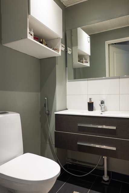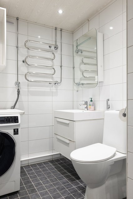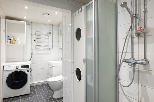 - Suihku, korkea pyykki-ja pyyhekaappi, pesukoneliitäntä. allaslaatikosto, peilikaappi, pyyhekuivain, wc-istuin, bideesuihku. Lattiat tummanharmaata laattaa, seinät kiiltävää valkoista laattaa. Kylpyhuone remontoitu v. 2018. Taloyhtiö valvonut vesieristeen ja saunan höyrysulun.