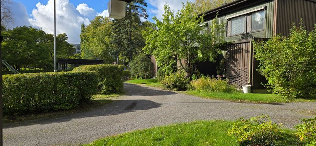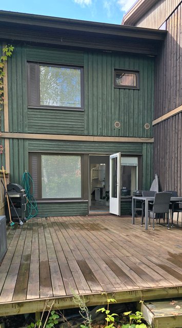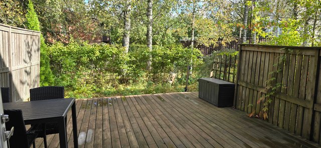 - Takapihalla todella iso puuterassi. Terassille mahtuu ruokapöydät, grillit, sohvakalustot, kukka- ja yrttiruukkuja ym. ym. Toki pihalle mahtuu myös trampoliini.
