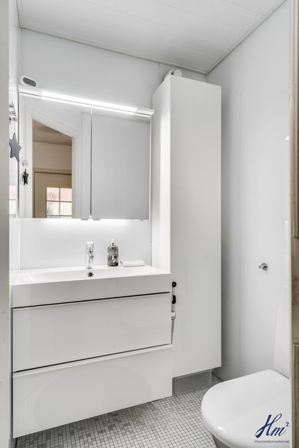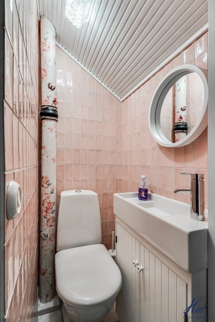 - Asuinkerroksen wc n varusteet: wc-istuin, käsienpesuallas, allaskaappi, bidee, peilikaappi. Ullakokerroksen wc n varusteet: wc-istuin, käsienpesuallas, allaskaappi, peili.