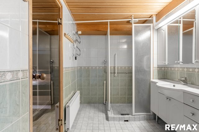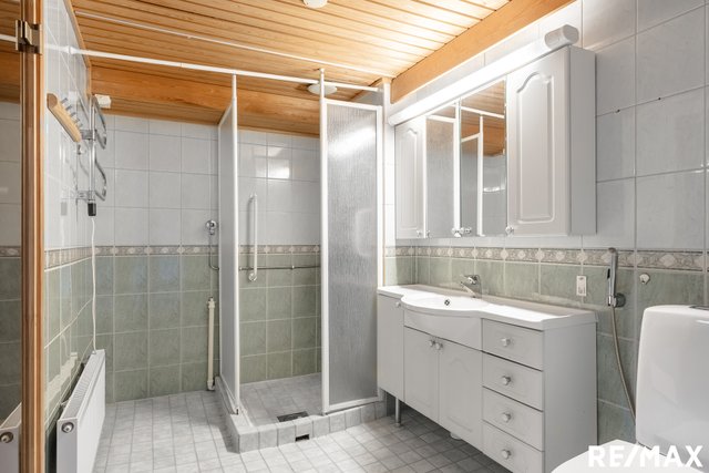 - WC-istuin, suihku, suihkuseinä, pesukoneliitäntä, peilikaappi, allaskaappi, pesuallas, bidee-suihku, ja rättipatteri